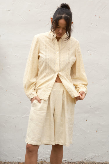 A sit on the hips pull on short. Jasper fits the body with back darts, pockets, front pleats and a 2" bias waistband. The bias waistband gives over the hips so there is less fabric around the middle. We love the fullness of the short that feels sort of like you are wearing a skirt.