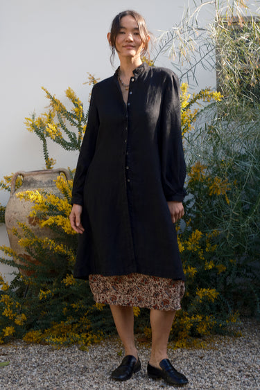 A fitted Coat Dress with a band collar and small abalone shell buttons. Features a full balloon sleeve tucked into a button cuff.