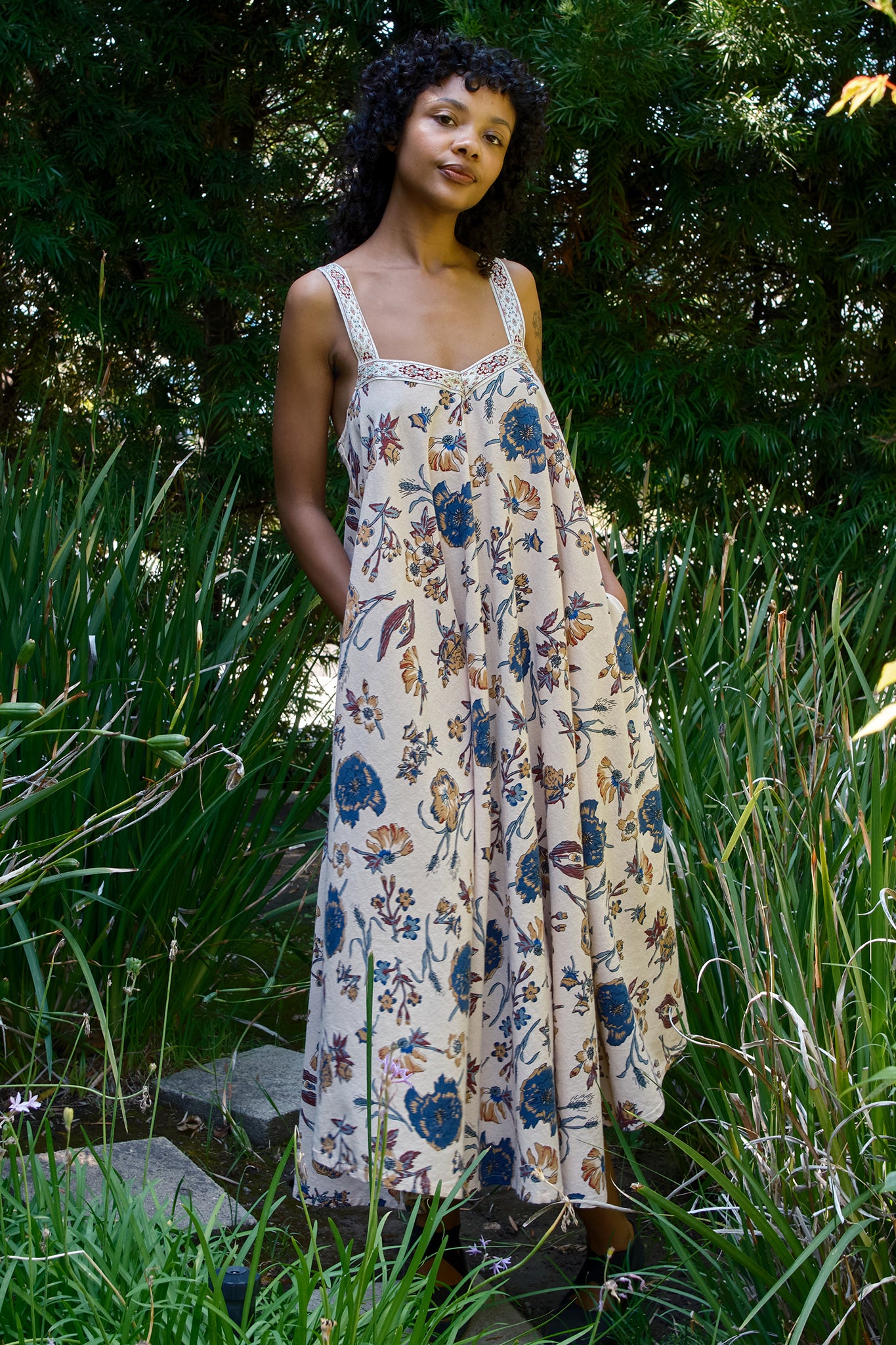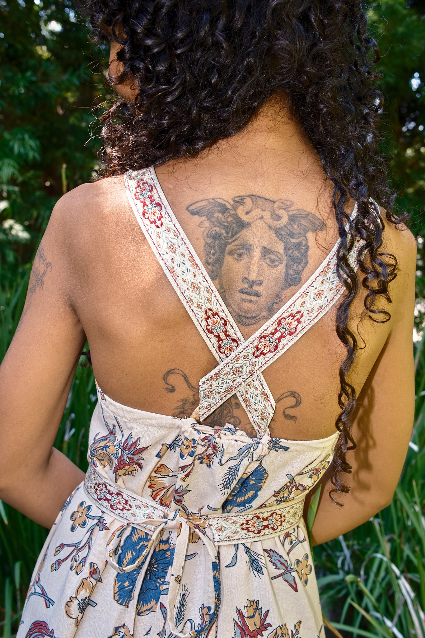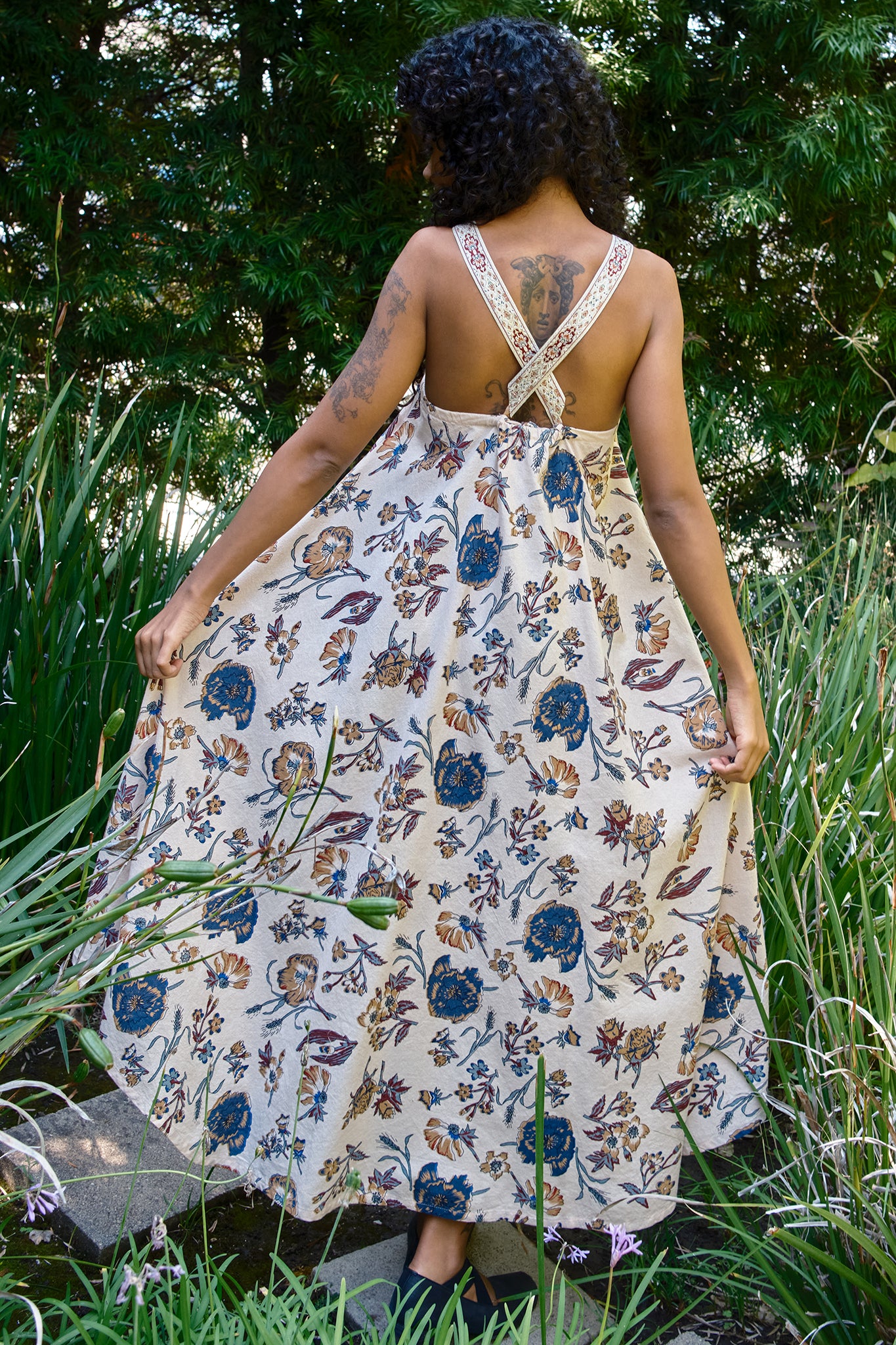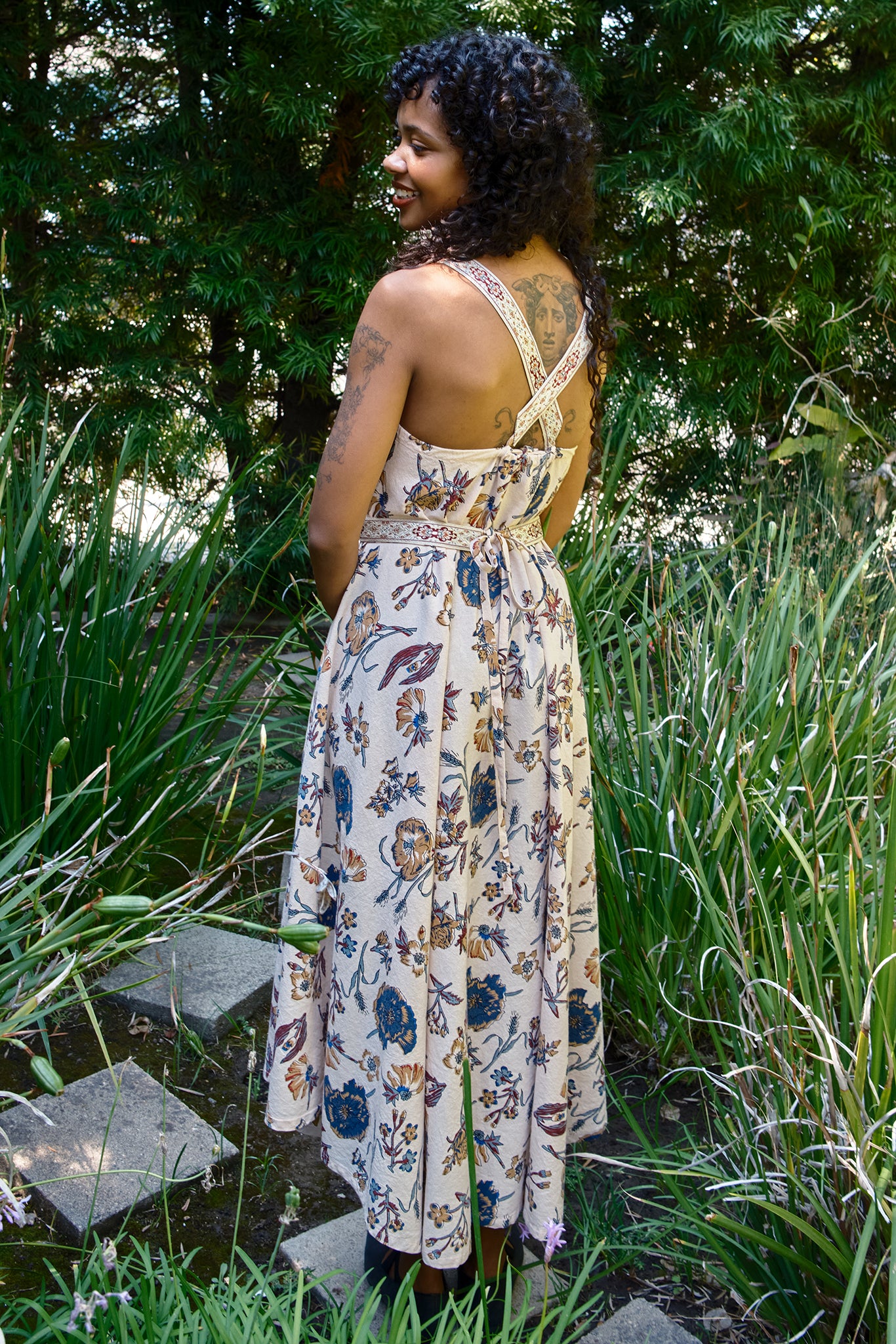 A sun dress decorated with vintage ribbon at the neckline, straps and belt. The dress is a true half circle. Features adjustable straps, pockets and a ribbon belt. This piece is washable.