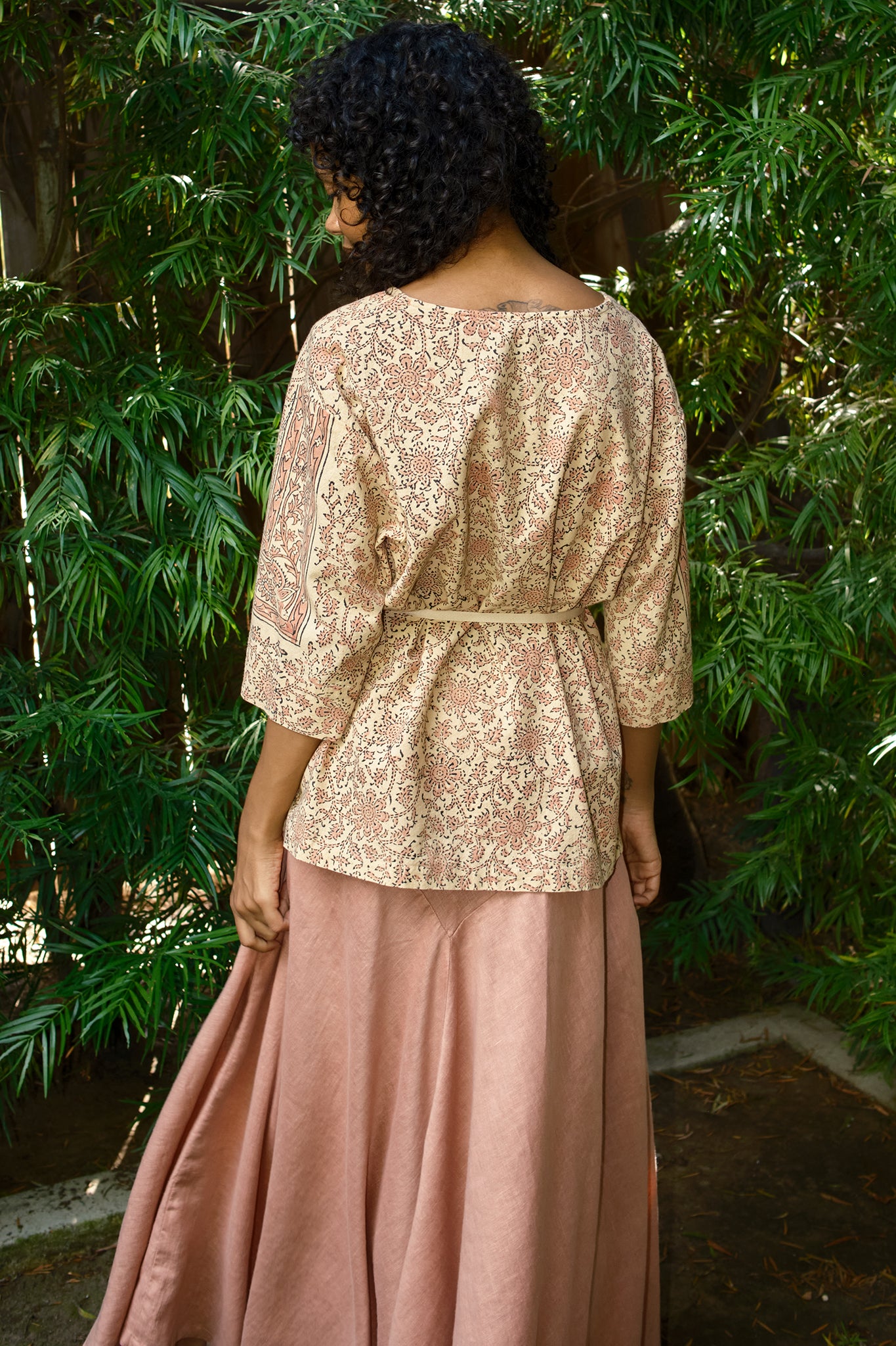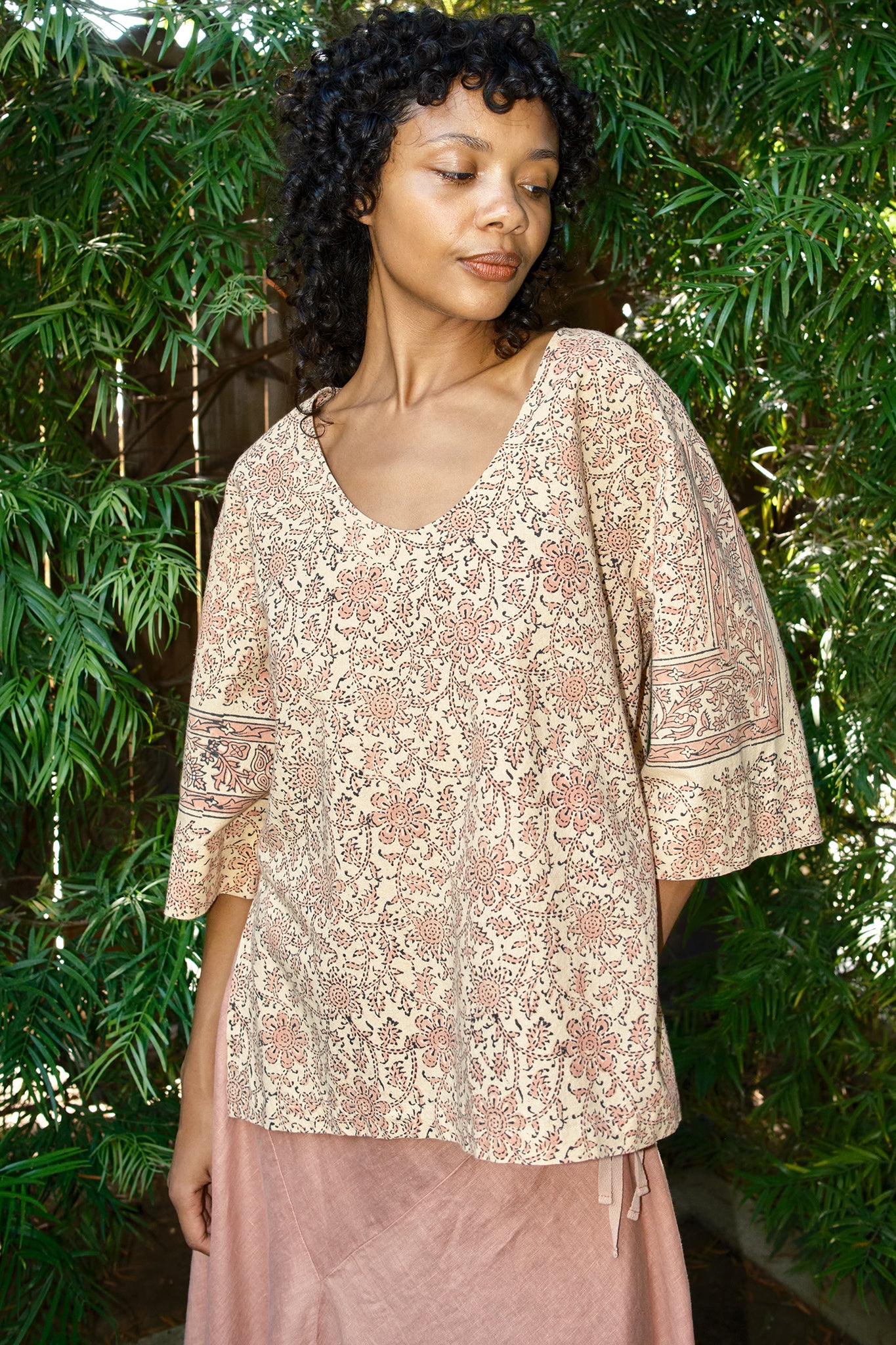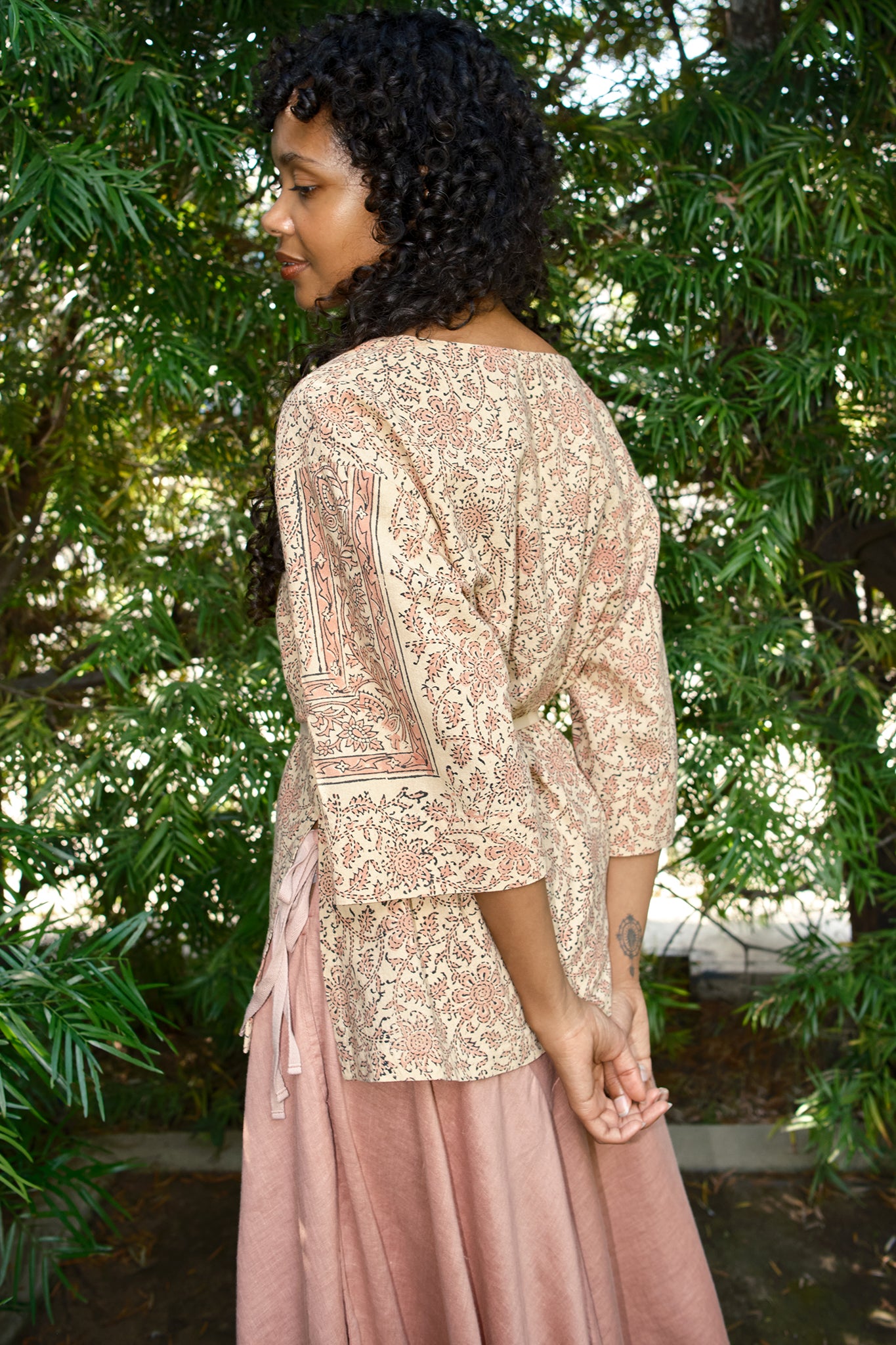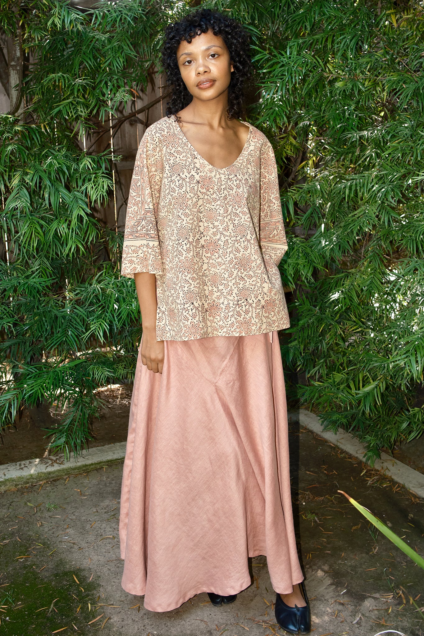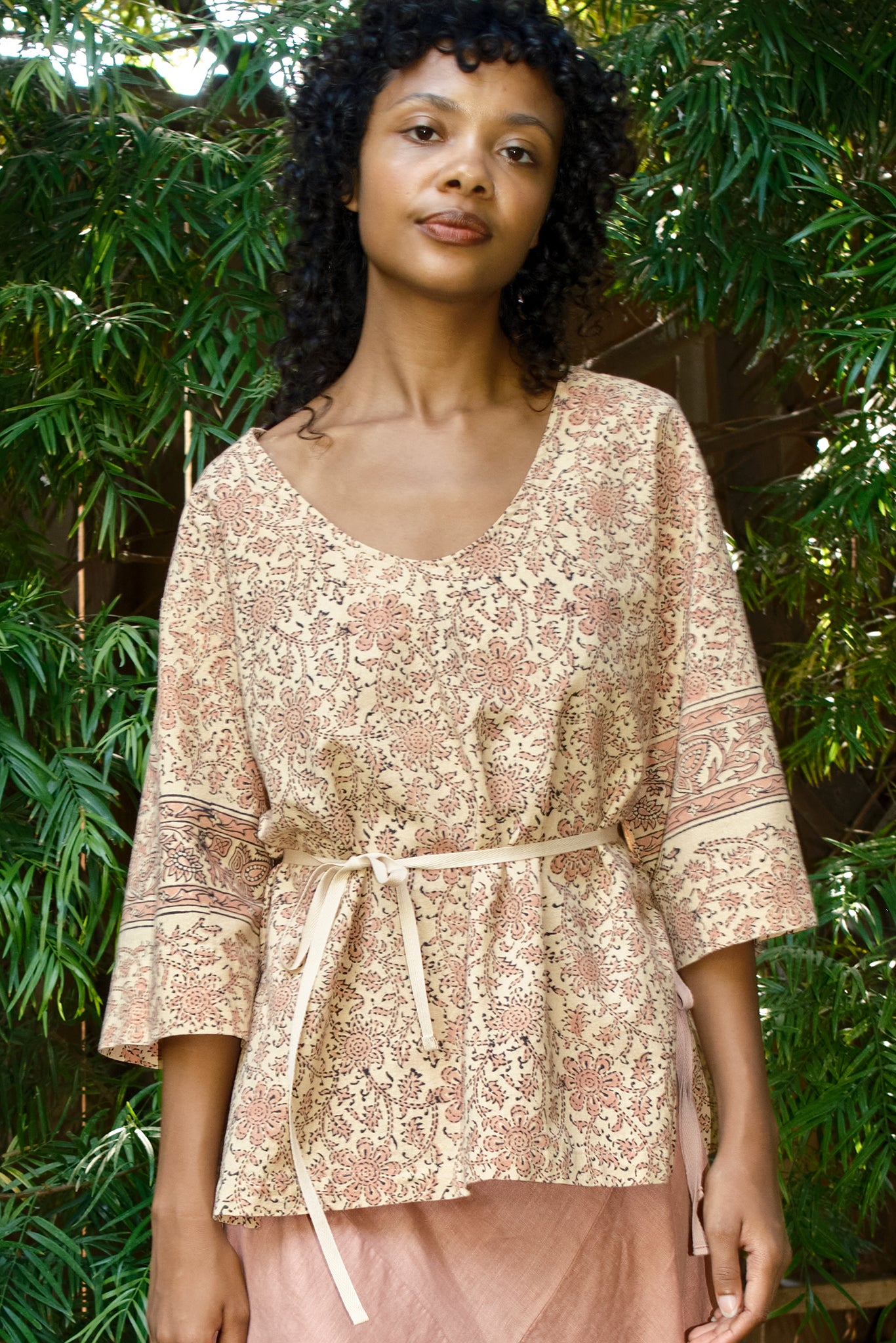 Esme is a hip length tee. Features elbow length sleeve with a deep hem to cuff, or not, scoop neckline, deep side slits and a almost matching twill ribbon belt.