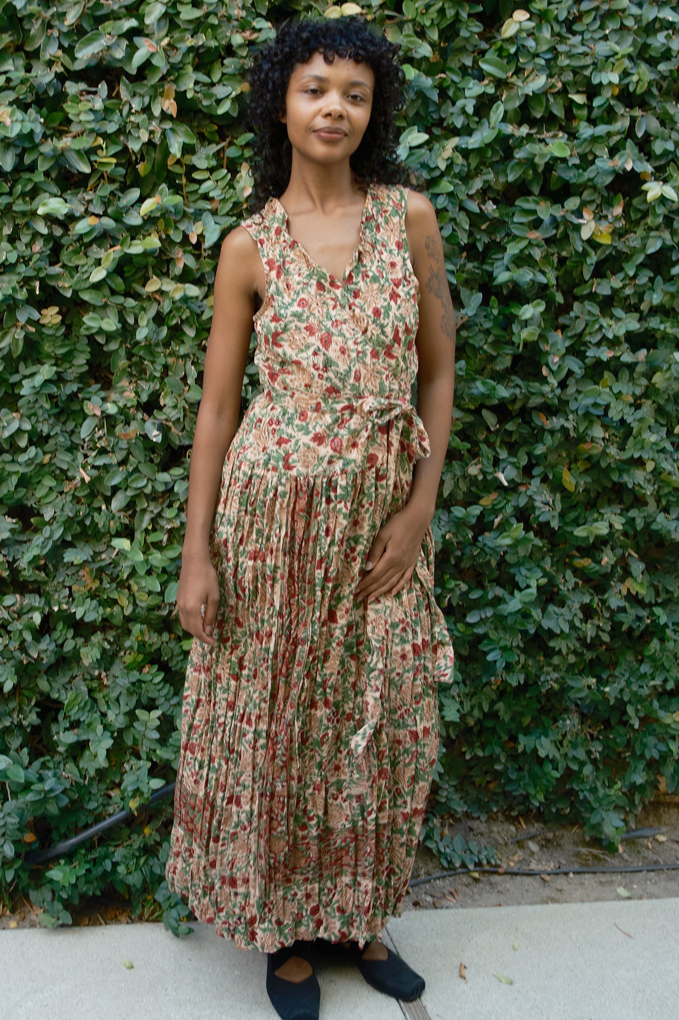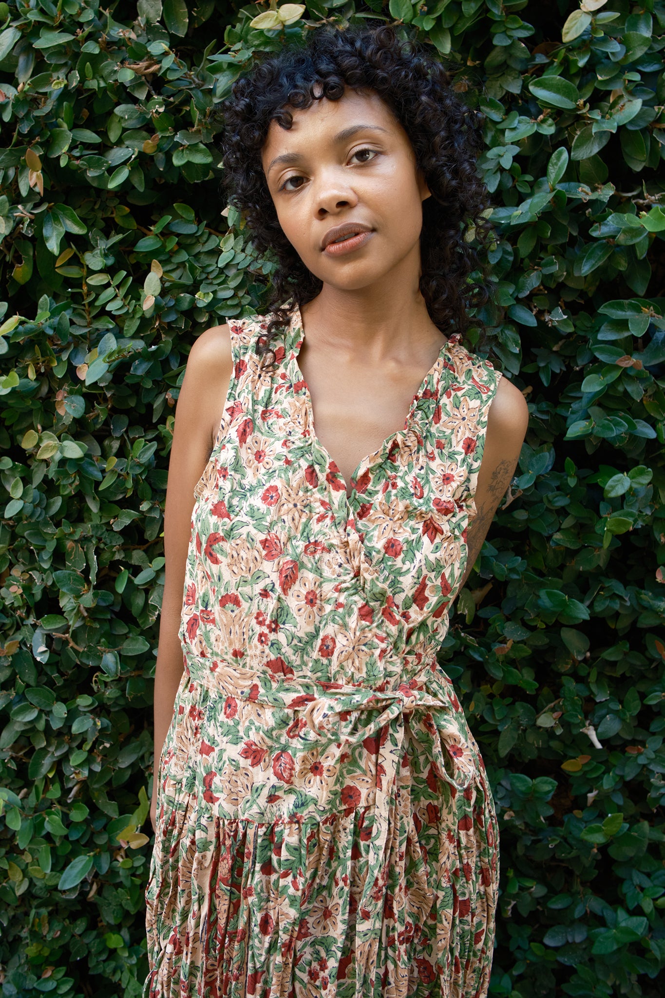Broomstick Pleated Flora wrap dress features an elastic neckline with a ruffle, an empire waist wrap with circular skirt yoke with a shirred skirt, pockets.