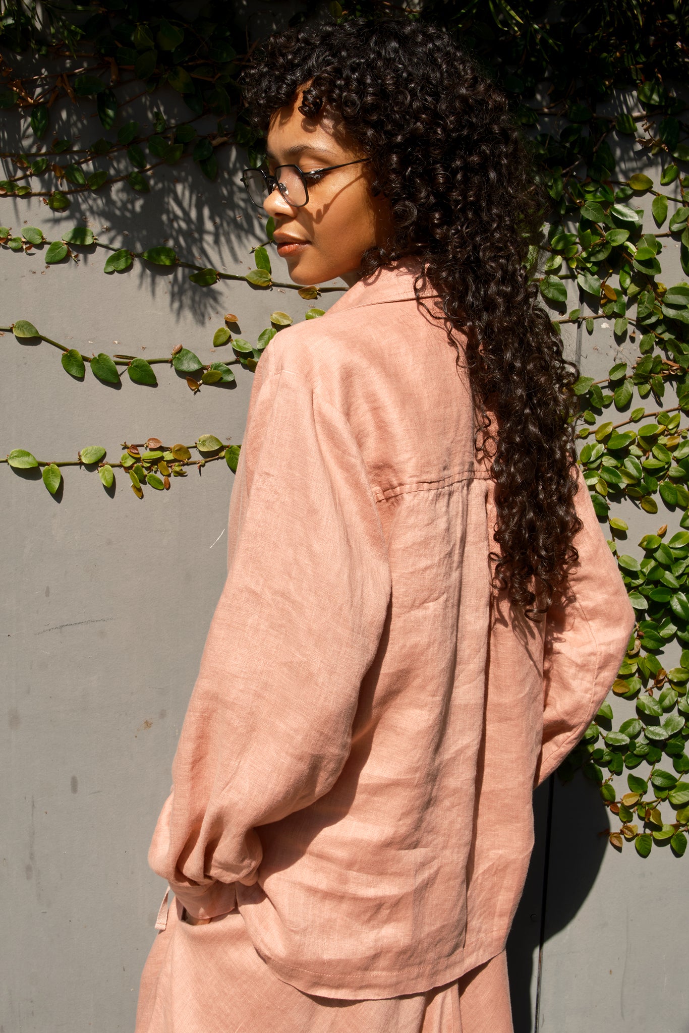 Cut in linen woven in Europe. This fabric has a subtle sheen. We source our linen locally, in Los Angeles where the colors are stocked dyed and finished.